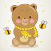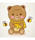 Diseño de un osito de peluche comiendo miel en compañia de las amistosas abejas que vuelan a su alrededor.